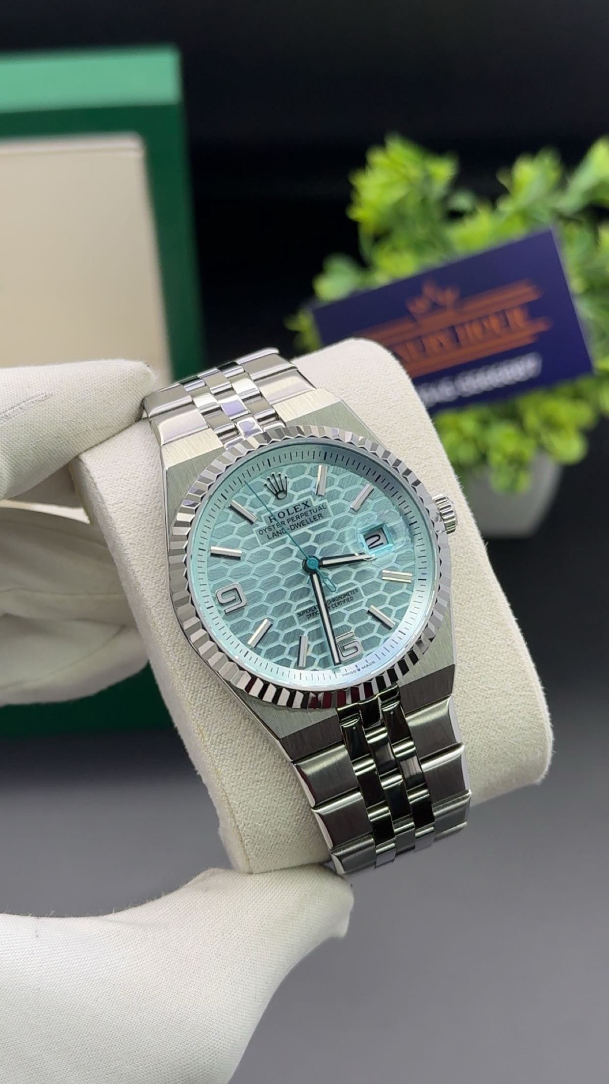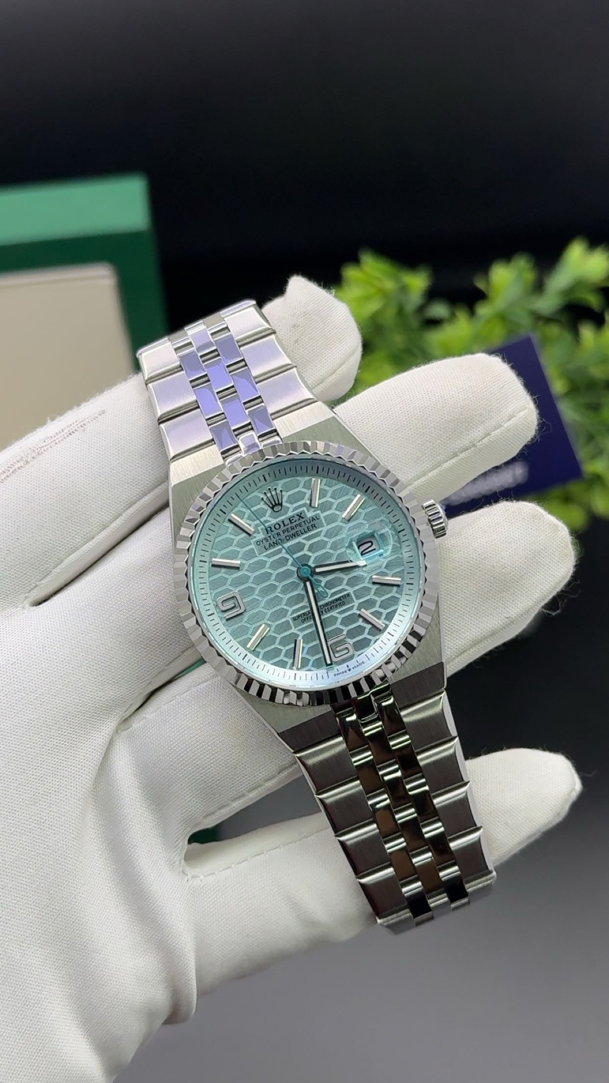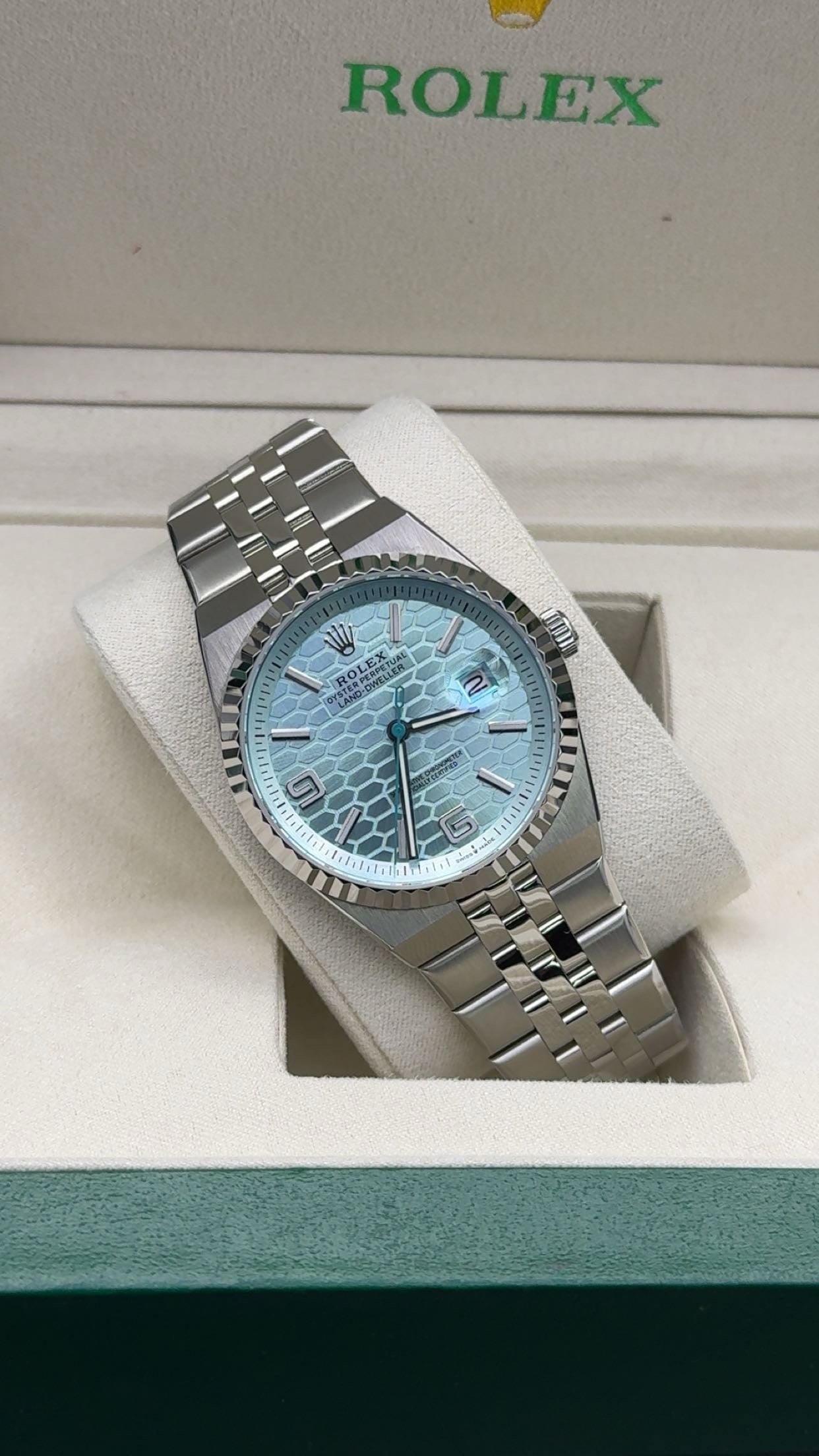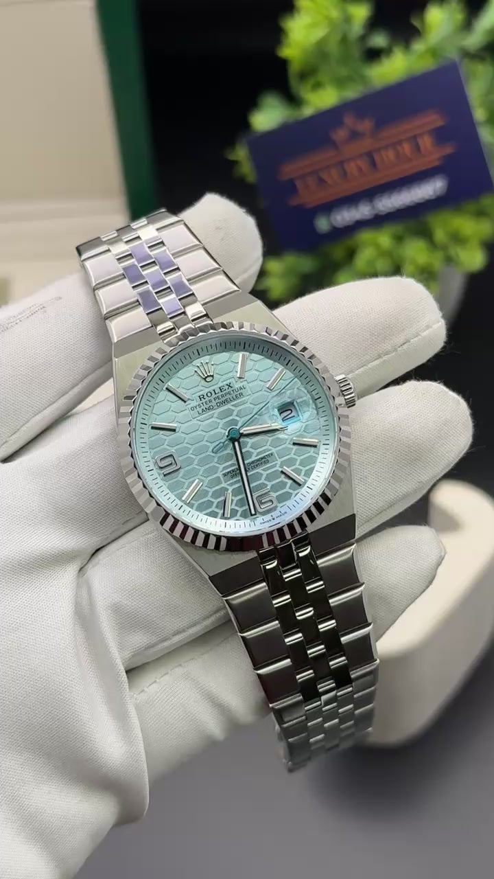 •Silver with sky blue dial.