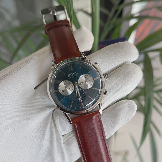 Silver with blue dial and brown strap